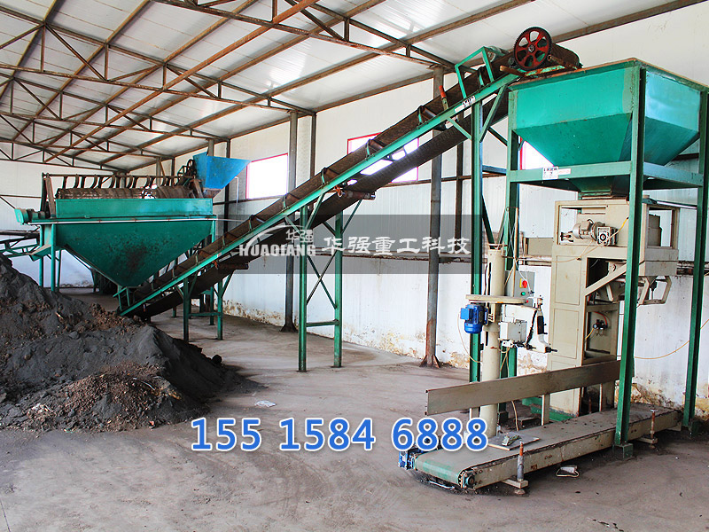 進(jìn)一步對堆肥成品進(jìn)行篩分,篩下物根據(jù)水分含量高低分別進(jìn)行處理。篩下物造粒后,送入由沼氣池沼氣供熱的烘干機(jī),進(jìn)行烘干,按比例添加中微量元素后攪拌混合后制成成品,進(jìn)行分裝,入庫待售。篩上物返回粉碎工序進(jìn)行回用。