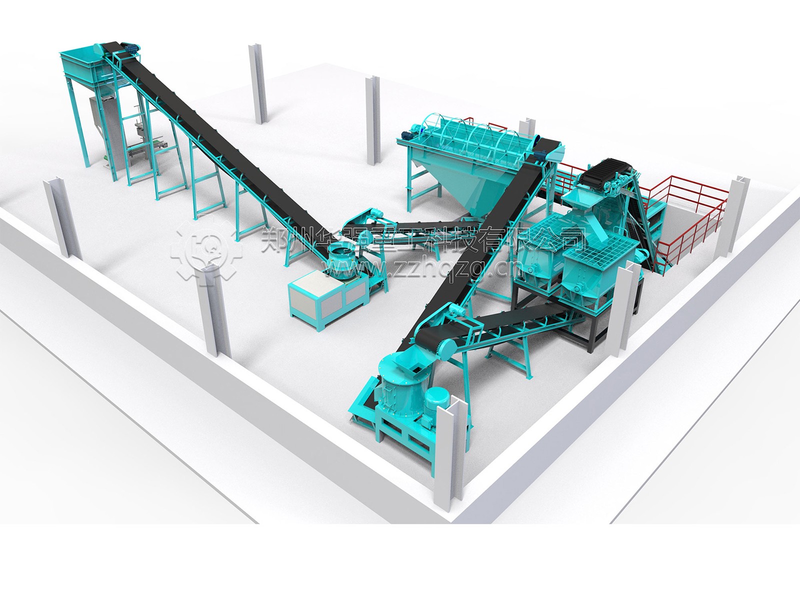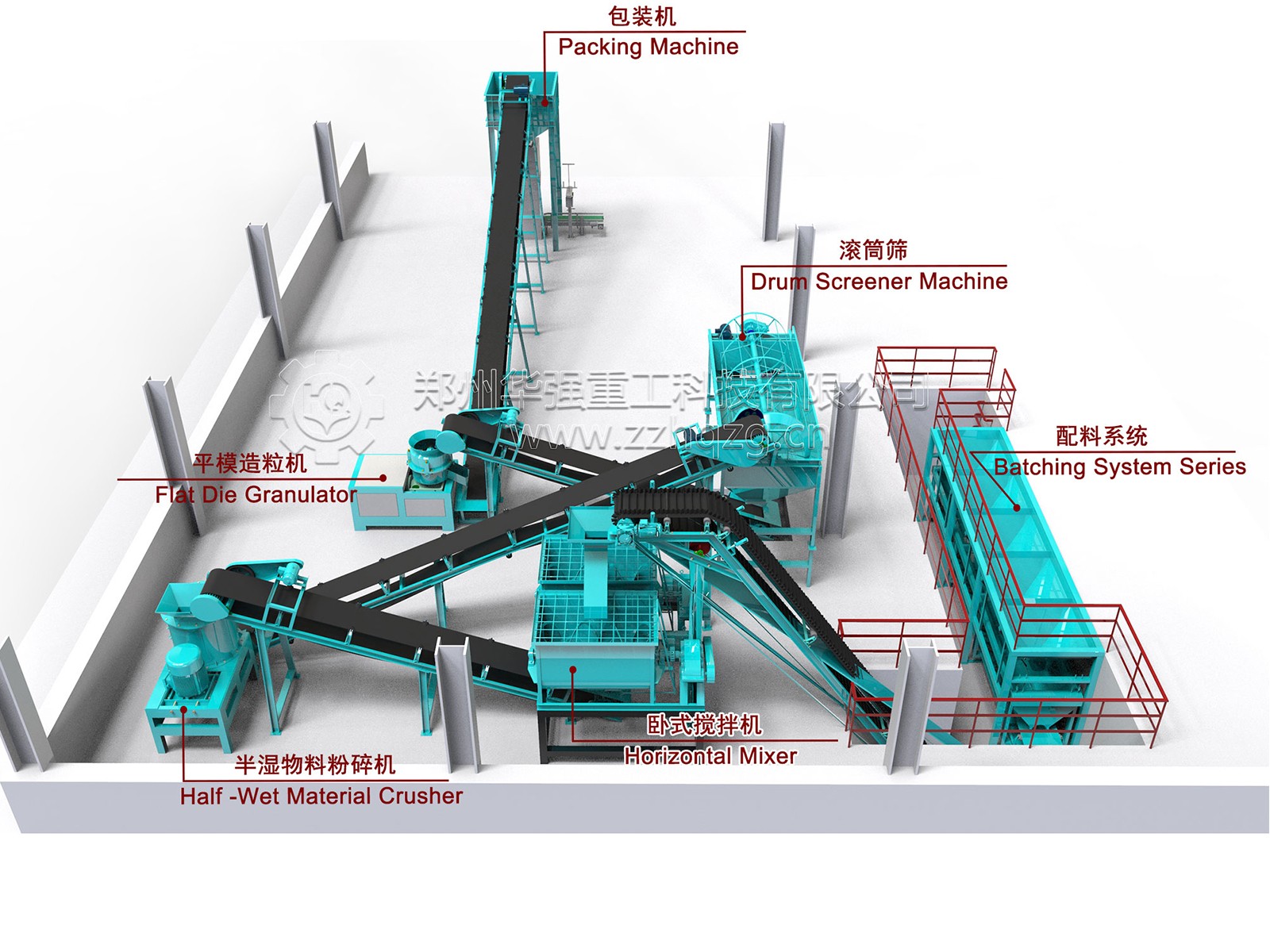 將堆肥后的物料和氮磷鉀無(wú)機(jī)肥料及其他添加物等各種原料按一定比例進(jìn)行粉碎、配比和混合。根據(jù)多年經(jīng)驗(yàn),設(shè)備配套建議如下:采用立式粉碎機(jī)粉碎牛糞堆肥物不易粘壁,不易堵塞,多層紊流鏈錘結(jié)構(gòu)改善粉碎性能;