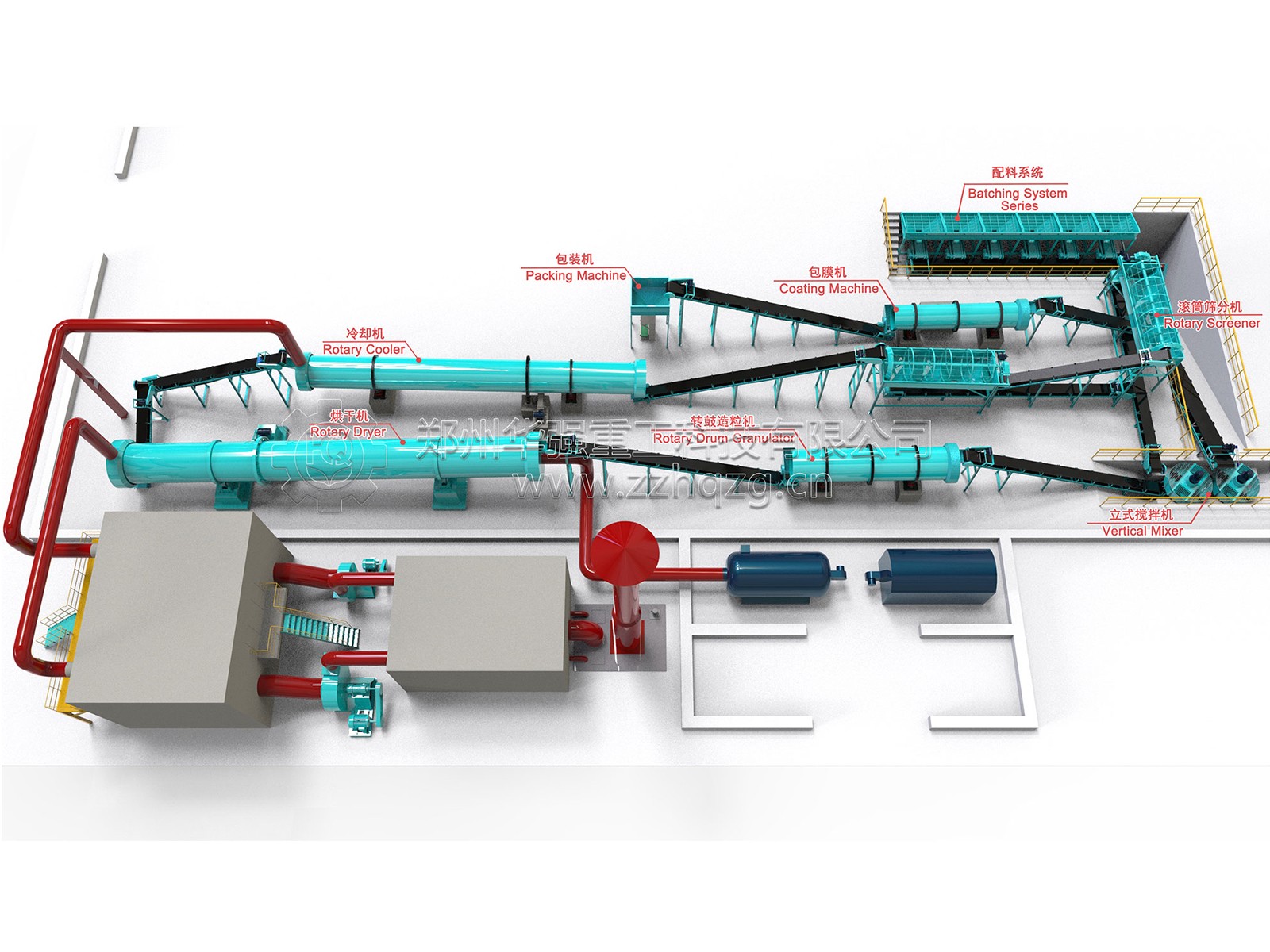 工藝流程:配料系統(tǒng)——滾筒篩分機——立式攪拌機——轉(zhuǎn)鼓造粒機——烘干機——冷卻機——自動包裝機。